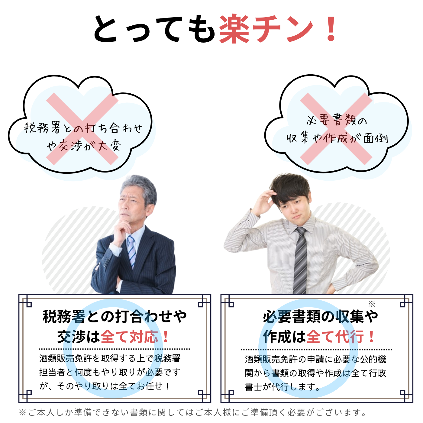 つまり、依頼者様は弊所が用意したリストをもとに必要書類の収集と研修を受講するだけで酒類販売業免許が取得できます。