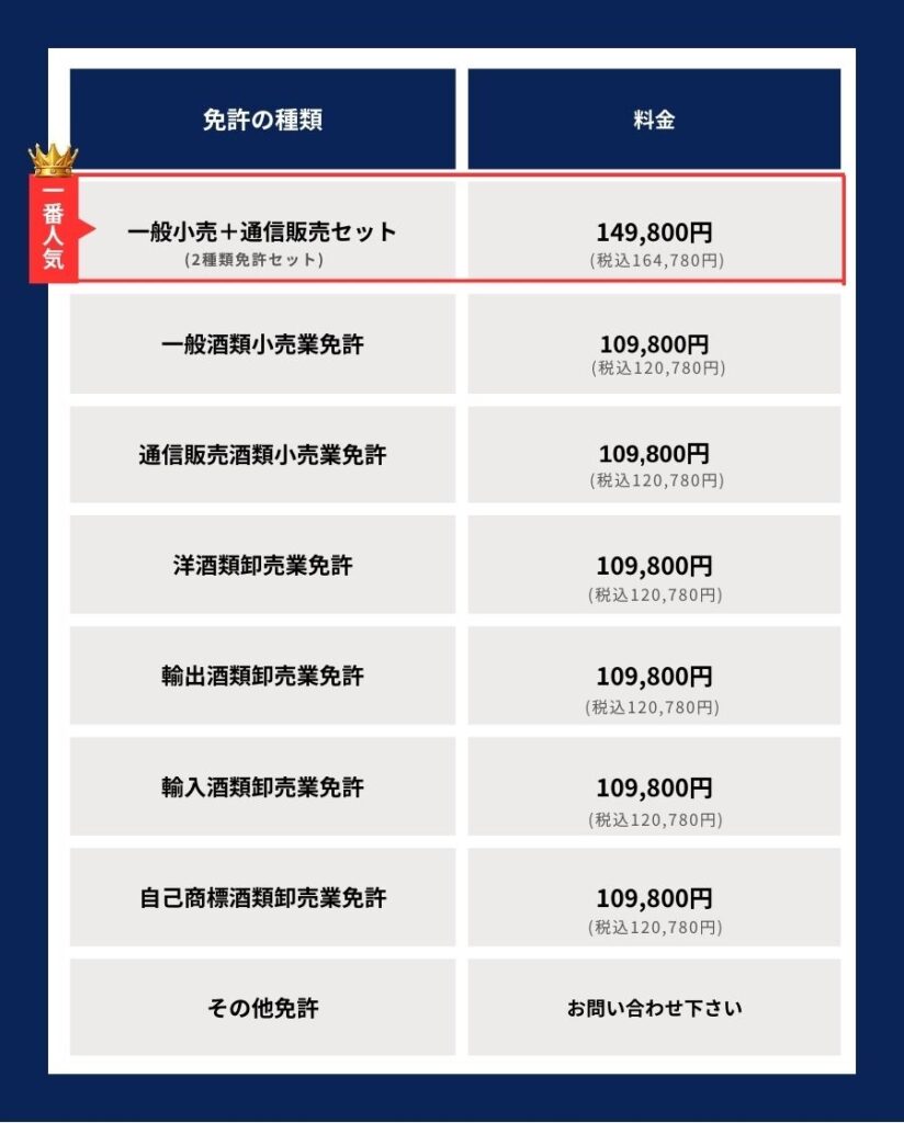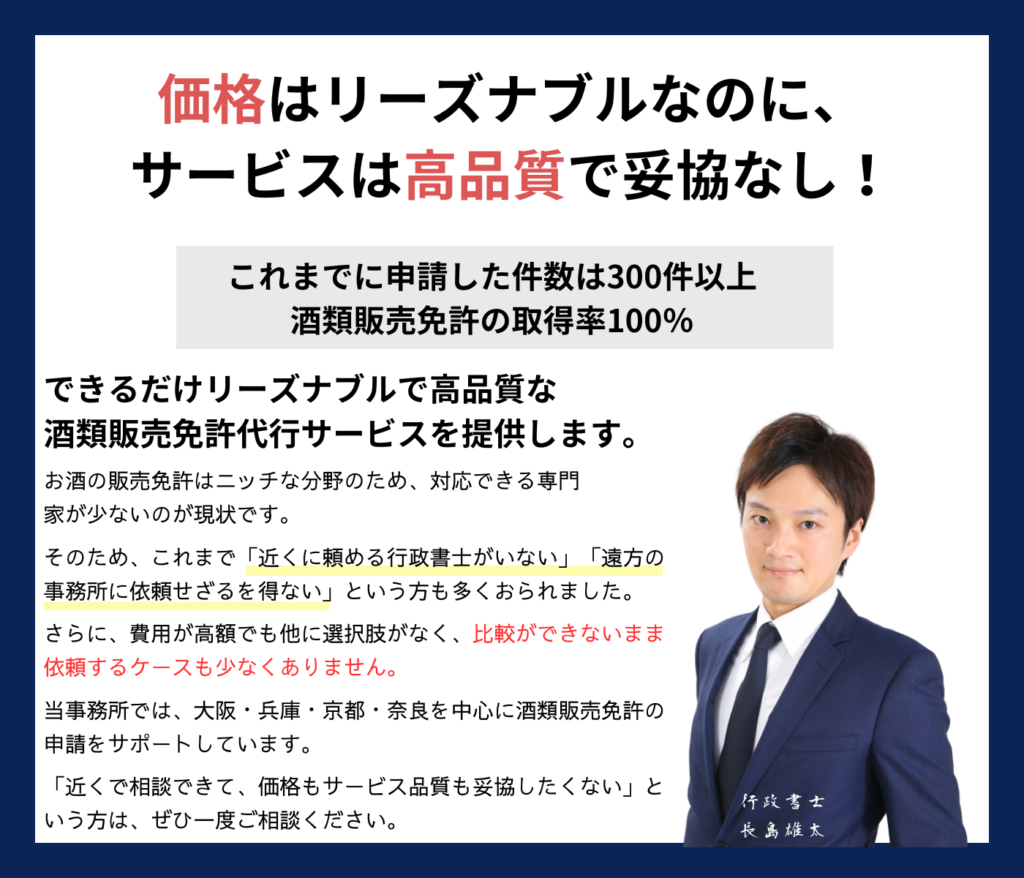 NAGASHIMA行政書士事務所に酒類販売免許の申請をご依頼頂いた場合のサービス内容は以下となります。