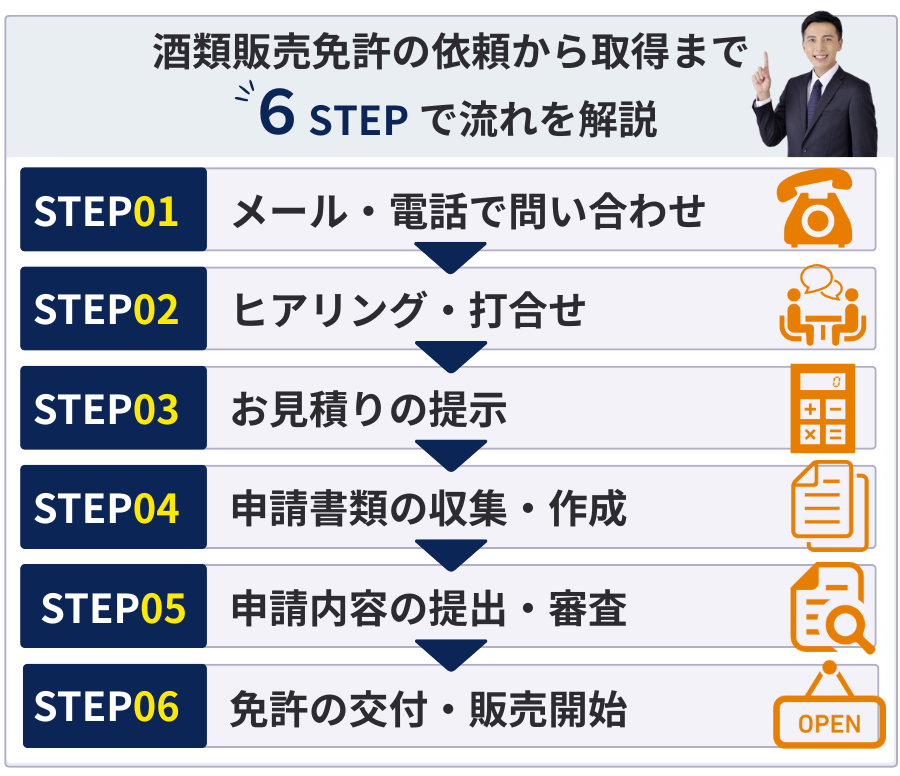 弊所にご依頼頂いてから、酒類販売業免許を取得できるまでの流れは上記のような6つのステップとなります。